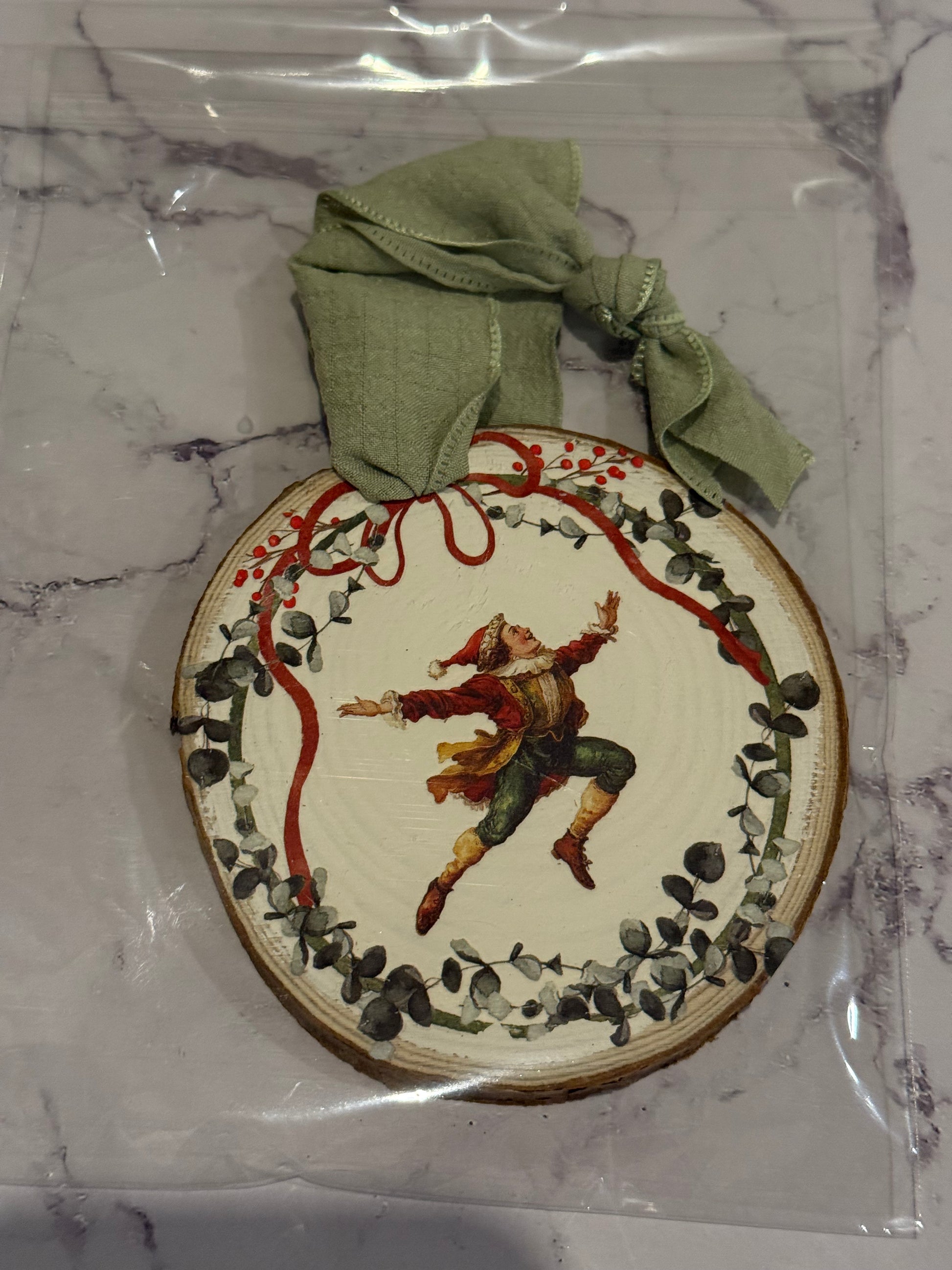 These handcrafted ornaments celebrate the timeless charm of the season. Each piece begins as a natural wood round—approximately 4" in diameter and ½" thick—sanded smooth and painted with Annie Sloan Chalk Paint for a soft, vintage-inspired finish.
